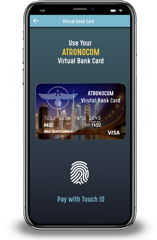 Members of the ATRONOCOM Legion who have downloaded the DApp and filled out the registration form can activate their Virtual Bank Card immediately and order one or more Physical Partner Cards directly and then use them for many functions. The bank card is directly connected to the ATRONOCOM system and can be used at almost 40 million contact points worldwide